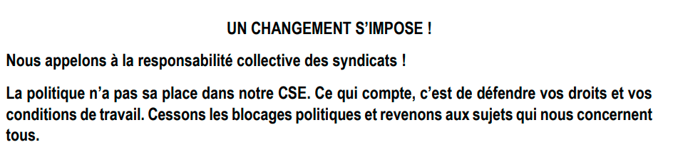 Pourtant les élus du syndicat majoritaire continuent de dépenser comme si de rien n’était … Cette soirée a été décidée sans vote des élus titulaires comme il en est d’usage dans une assemblée respectueuse de la représentativité. La non présentation des comptes du CSE 2024 est aussi un signe inquiétant …