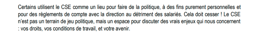 Il semblerait que la « politique » tant décriée chez les autres soit devenue une vocation soudaine pour celle qui est censée porter votre voix au sein de l’instance. L’ironie est savoureuse : on nous fait la leçon sur la neutralité syndicale pendant que l’on prépare ses propres affiches électorales.